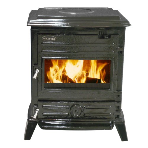 The superior quality and construction of the finely detailed cast iron with a black porcelain finish ensures the Forester Wood Stove as a welcomed addition to any room. The double top heat plate cover and cast iron construction provides additional heat retention and versatile installation assured with a rear heat shield. This stove is EPA Certified, clean-burning (tax credit eligible), and has a low environmental impact. It includes a convenient, but hidden, ash drawer, "simplex" heat control with one lever, and a full view air wash system for cleaner glass with less maintenance.