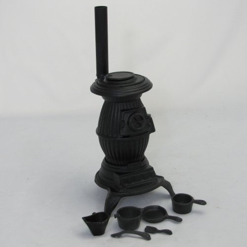 This Old Mountain cast iron mini pot belly stove set is black in color and an exact replica of railroad heating stoves from years gone by. This Old Mountain pot belly stove comes complete with stove pipe, burner cover, a coal bucket and shovel, a pot, pan, and skillet. This stove measures 13" tall, x 5 3/4" wide and deep.